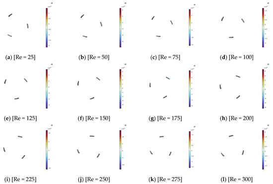 Pressure distribution contours for blade model M3 (RD = −15 mm) at Reynolds numbers of (a) 25, (b) 50, (c) 75, (d) 100, (e) 125, (f) 150, (g) 175, (h) 200, (i) 225, (j) 250, (k) 275, and (l) 300.