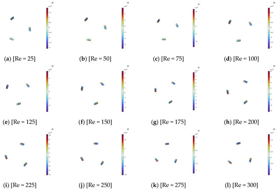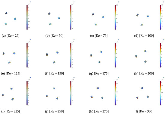 Moving toward near-neutral curvature, model M3 (RD = −15 mm) shows notable changes in pressure behavior. At low Reynolds numbers, the pressure distributions maintained a basic differential conducive to lift, but the suction region weakened and became less extensive (Figure 11a). With increasing Reynolds number, the pressure gradients deteriorated markedly (Figure 11b–l), with larger zones of high pressure developing on the windward side and a reduced suction on the leeward side. These factors promote an earlier onset of flow separation, as evidenced by the increasing size of the stagnation regions and adverse gradients, which negatively impact the lift-to-drag ratio. This deterioration aligns with the observed broadening of the turbulent wakes and loss of flow coherence in the velocity analyses.