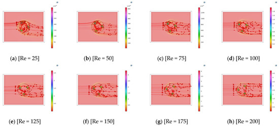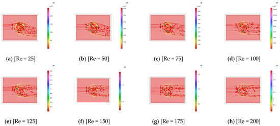 Model M2, characterized by moderately convex curvature (RD = −30 mm), shows a similar aerodynamic pattern but with subtle differences. At low Reynolds numbers, the flow attachment remained strong (Figure 3a), although the wake was marginally wider and less uniform than that of M1. Vortex shedding was initiated earlier at Re = 50 (Figure 3b), causing more pronounced wake oscillations as the Reynolds number increased. Despite this, the wake maintained reasonable coherence and flow stability across the Reynolds number range, supporting a relatively efficient aerodynamic behavior.