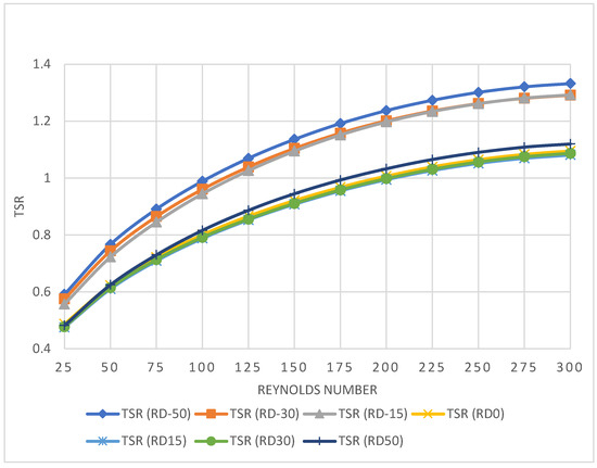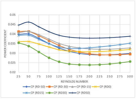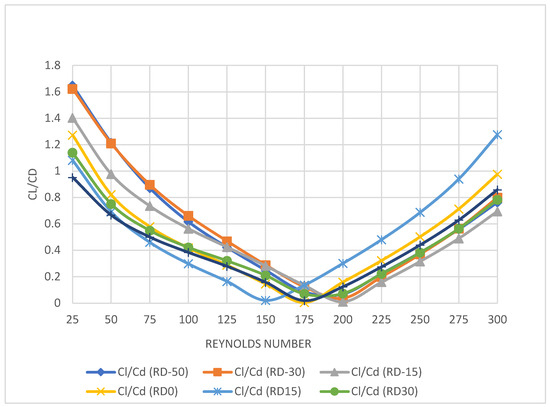 This section elaborates on the aerodynamic performance of the seven vertical axis wind turbine blade configurations (M1 to M7) under a range of Reynolds numbers (Re = 25 to 300), reflecting conditions typical of low-speed, small-scale urban wind energy systems. The analysis incorporates critical aerodynamic metrics, including the lift-to-drag ratio (Cl/Cd), pressure coefficient (CoP), power coefficient (Cp), torque coefficient (Ct), and tip speed ratio (TSR). These parameters collectively illuminate how the blade curvature transformation depth (RD) influences turbine efficiency, torque stability, and rotational dynamics.