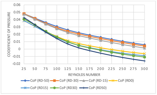 The pressure distribution over wind turbine blades is a fundamental determinant of aerodynamic performance, directly influencing the lift generation, drag forces, and flow stability. The CFD simulations in the present study revealed clear distinctions in the pressure fields among the blade configurations with varying curvatures (transformation depth RD) and Reynolds numbers ranging from 25 to 300. Understanding these pressure dynamics is essential for explaining the variations in the power extraction efficiency and flow behaviors observed in the velocity fields. Model M1 (deeply convex, RD = −50 mm) consistently shows the most favorable pressure characteristics throughout the Reynolds number range. At Re = 25, the pressure field (Figure 9a) illustrates a pronounced suction zone on the leeward (downwind) side of the blade, with the pressure dropping to values near −1.5, whereas the windward side maintains an elevated pressure, establishing a strong pressure differential essential for lift generation. This distribution promotes stable flow attachment and minimizes adverse pressure gradients that can trigger early separation. As the Reynolds number increased, the pressure gradients maintained their strength and uniformity (Figure 9b–l), indicating that the convex geometry robustly supported the aerodynamic loading, even under increased inertial forces. The consistently high suction pressure and smooth pressure transitions reduced drag and contributed to the narrow, coherent wakes observed in the velocity analyses.
