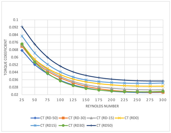 The velocity magnitude contours and flow streamlines for blade models M1–M7 across Reynolds numbers from 25 to 300 elucidate the significant influence of blade curvature on flow behavior and wake development in small-scale vertical axis wind turbines (VAWTs). These results provide a clear understanding of how aerodynamic efficiency varies with curvature transformation depth (RD) under low Reynolds number conditions. Model M1, with a deeply convex curvature (RD = −50 mm), exhibits attached laminar flow at the lowest Reynolds number (Re = 25), where velocity gradients remain smooth and the wake region behind the rotor is narrow and stable, indicating minimal turbulence and drag (Figure 2a). As the Reynolds number increases, vortex shedding emerges at Re = 75, slightly broadening the wake while maintaining coherence and flow stability (Figure 2c). Even at the highest Reynolds numbers (Re = 275–300), the velocity contours reveal sustained attachment and relatively compact wakes (Figure 2k,l), highlighting the superior aerodynamic performance associated with the convex blade shape.