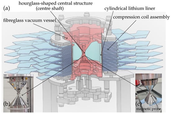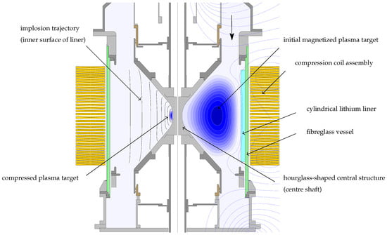 Lawson Machine 26 (LM26) for MTF demonstration was recently commissioned at General Fusion. LM26 aims to demonstrate the heating of magnetized plasmas as they are compressed by the electromagnetically imploded, initially cylindrical, solid lithium liner [15]. A schematic ( cross-section) of LM26 is shown in Figure 1. Here, a magnetized plasma target is injected into a vacuum cavity by the plasma injector (also known as a Marshall gun) as shown by the black arrow. The volume occupied by the plasma is constrained on the inside by the solid hourglass-shaped central structure (often referred to as the “centre shaft” in the manuscript) and by the lithium liner (shown by the cyan rectangle) on the outside. The vacuum boundary behind the liner is established by a cylindrical fibreglass vessel shown by the green rectangle. To shape the initial plasma and to prevent it from touching components of the machine on the liner side, a background poloidal magnetic field is generated inside the apparatus prior to the injection of the plasma. An example of such a field is shown by the blue contours on the right-hand side of the figure. The electromagnetic compression coil assembly (shown by the yellow rectangles) powered by a high-voltage capacitor bank causes the liner to implode, compressing the magnetized plasma. A typical trajectory of the inner surface of the liner during the implosion, along with the final shape of the compressed plasma, is shown on the left side of the figure.
