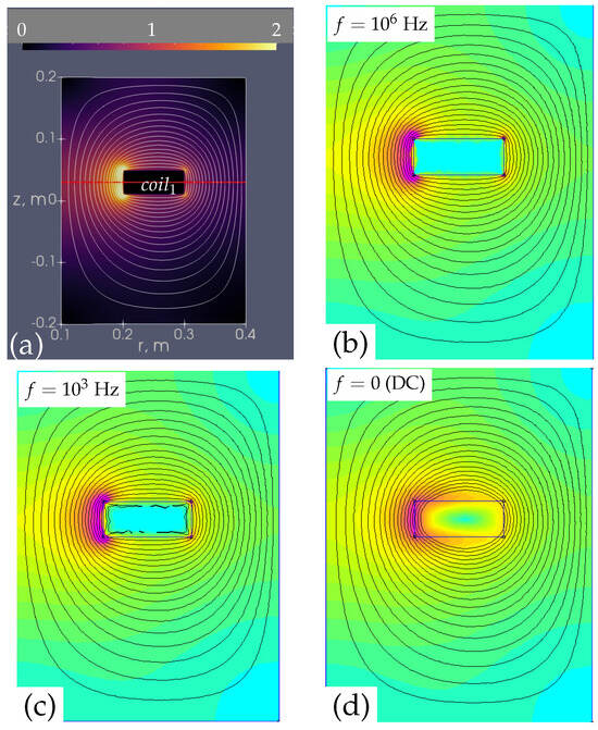 One can see that the results obtained with OpenFOAM are very similar to those obtained with FEMM for high-frequency current, when there is very little penetration of the magnetic field into the coil (compare Figure 2a,b). When comparing FEMM solutions for and , the magnetic fields outside the coils are very similar, even though there is some penetration of the field into the coil for . In the DC current scenario, the magnetic field is fully diffused through the coil and some changes to the magnetic field structure around the coil can be observed.