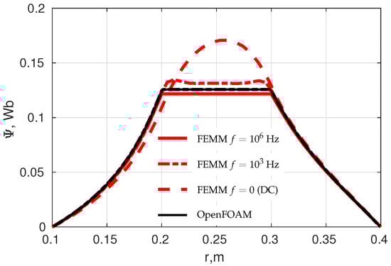 The radial profiles of the poloidal flux at the axial position aligned with the middle of the coil (as shown by the red line in Figure 2a) for the four simulations in Figure 2 are shown in Figure 3. OpenFOAM results are plotted with a black line. FEMM results are shown using red lines, with solid, dash-dot and dashed lines corresponding to AC current with frequencies , , and (DC), respectively. One can see that for high-frequency AC current, the distribution of the poloidal flux outside the coil is almost identical in OpenFOAM and FEMM. For DC current, the distribution of outside the coil is also not greatly dissimilar from that obtained with high-frequency AC current, despite the magnetic field being fully diffused into the coil. Resolution and domain size checks were performed for both codes to ensure convergence of the results.