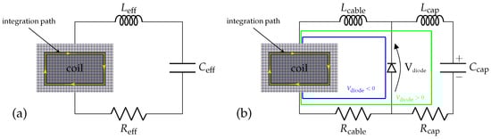 For a circuit that includes a diode, when the diode is on, the RLC circuit switches to an RL circuit, as shown by the blue loop in Figure 4b. Electric current then decays according to the corresponding effective resistance and inductance as per (Equation (A17)):