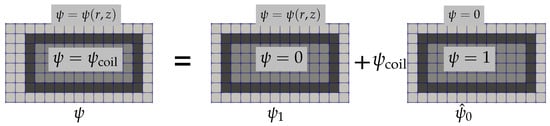 Decomposition of the poloidal flux field for the implementation of the circuit model. Dark grey cells constitute the integration path for the line integral in Equation (6). At each time step, the poloidal flux field is reset to for cells comprising the coil. For the line integral calculation, the poloidal flux is decomposed into two parts: (1) field : is set for the coil cells and outside, and (2) field : for the coil cells and outside. As the value of is the same for all cells comprising the coil, it can be taken outside as a constant multiplier in front of .