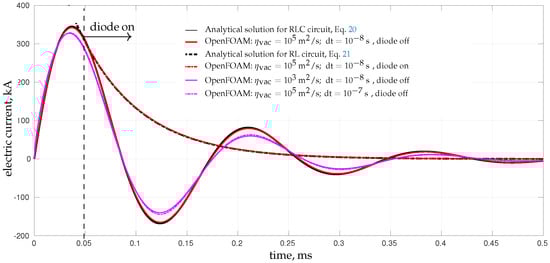 Comparison between the electric current calculated in OpenFOAM simulations of a single electromagnetic coil in a vacuum chamber connected to an external circuit and the analytical solution obtained for the same values of effective resistance, inductance, and capacitance. OpenFOAM results for the basic RLC circuit (without diode) are shown by the solid red (, ), solid magenta (, ), and dash-dot magenta (, ) lines. The corresponding analytical solution (Equation (20)) is shown by the solid black line. Electric current calculated for the circuit including a diode is shown by the red dash-dot line, with the analytical solution given by Equation (21) (valid from the moment the diode is activated) plotted with the dashed black line.