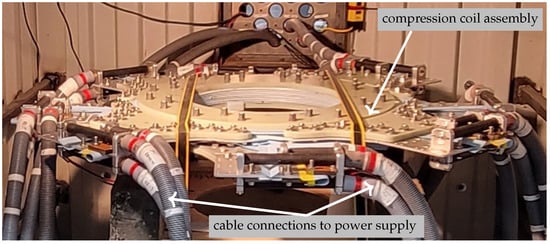 The experimental electromagnetic compression system for the implosion of a solid lithium ring is shown in Figure 7. The compression coil assembly is constructed from individual thick aluminum plates (turns) that are stacked on top of each other with insulating material between them (DMD100.3753, Electrowind). This design allows flexibility in tuning the magnetic field produced by the compression coil assembly by varying the number of plates, the electrical connection between plates, or the spacing between the plates. For this experiment, the compression coil assembly is composed of eight identical plates (turns), combined into two coils of four turns each. Within each coil, individual turns are electrically connected in series. Each of the two coils is connected to a bank of twenty four high-voltage capacitors (General Electric, 52 arranged in pairs) that can be charged up to . A solid lithium ring is placed inside the compression coil assembly and concentrically aligned with it. The compression system is located inside a shipping container to minimize the hazards of working with lithium and flying debris. More details on the experimental apparatus and data collection can be found in [32].