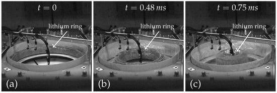 Snapshots of the lithium ring during the implosion captured by high-speed camera. The initial temperature of the lithium ring is 100 °C. (a) (before implosion); (b) ; (c) .
