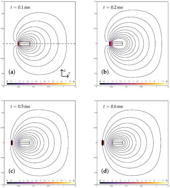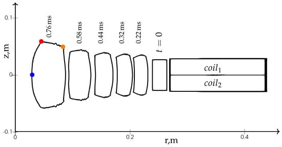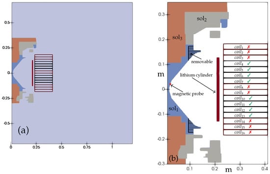 - At the beginning of the simulation, calculate the value in Equation (14) using the vector field (Equation (13), Figure 5). At , set the initial poloidal flux distribution in the domain to (including at the coil), current , full flux , and the capacitor charge based on the initial capacitor voltage .