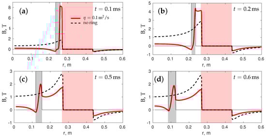 In the current implementation, the electromagnetic compression coil has the shape of an axisymmetric toroid with a rectangular cross-section and is assumed to be a perfect conductor, i.e., there is no diffusion of magnetic field into the coil. As such, the poloidal flux remains spatially uniform over the cross-section of the coil, so the grid cells comprising the coil have the same value of . This assumption is valid for high-frequency alternating current (AC), as penetration of the magnetic field (skin depth) is small (skin depth , where is electrical resistivity, f is current frequency and is magnetic permeability). The accuracy of this approximation for DC current depends on the problem in question. The poloidal flux is assumed to be zero at all boundaries of the computational domain , and the size of the domain is sufficient to minimize the effect of the boundary condition on the solution.