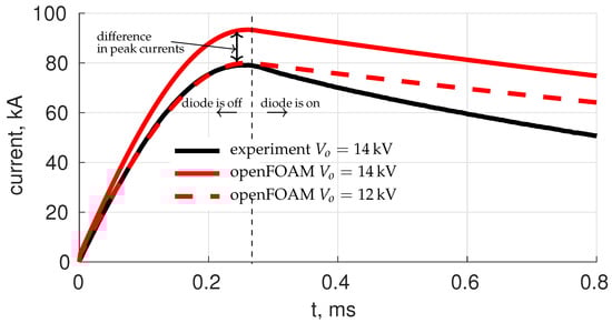 The comparison between OpenFOAM and the analytical solution is presented in Figure 6. Circuit parameters used in OpenFOAM simulations (see Figure 4b for circuit diagram) and corresponding effective parameters used in the analytical solution are listed in Table 2. OpenFOAM results obtained with nominal values for vacuum magnetic diffusivity and simulation time step ( and ) are shown by red lines for two cases: (i) solid red line—the diode is disconnected, and (ii) dash-dot red line—the diode is connected and turns on when the voltage across it becomes negative. The analytical solution given by Equation (20) with the parameters listed in Table 2 is shown by the solid black line. The analytical solution for the current decay in the RL circuit (Equation (21)) that describes the behaviour once the diode is turned on is shown by the dashed black line; values for the current and time are taken from the OpenFOAM simulation.