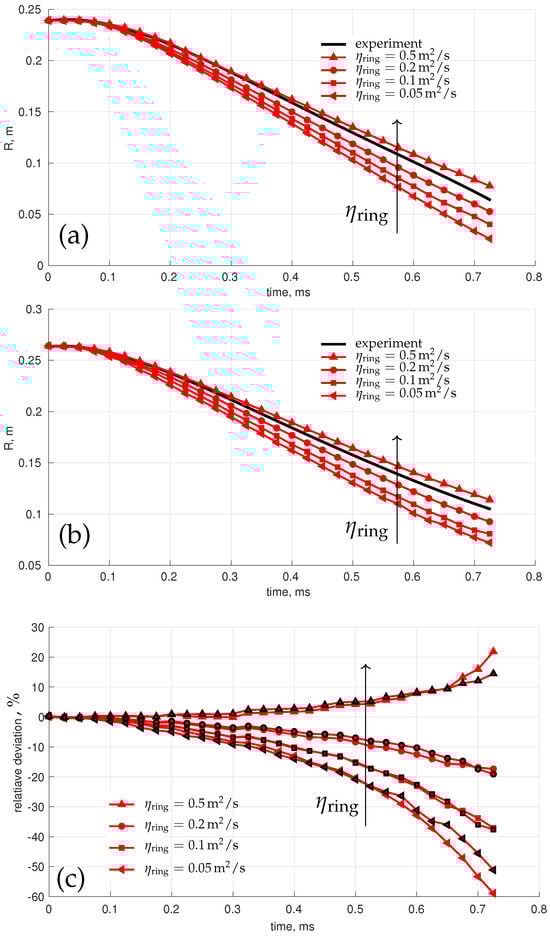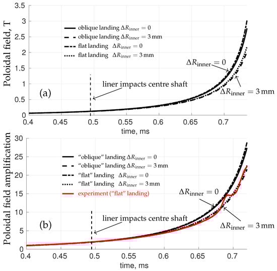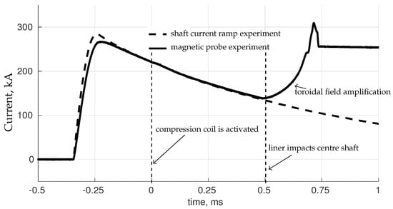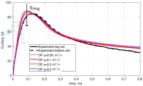 Following the experimental setup, the compression coil assembly comprises two separate coils (denoted and ), with four turns each. Each of the coils is connected to its own RLC circuit using effective parameters derived from the experimental circuit. The inner and outer radii of the coils are and , respectively. The height of the entire coil is with a vacuum (gas phase) gap of between the coils. The axial position is for and for . The effective circuit parameters used in the simulations presented in this section are as follows: , , , , , and (unless stated otherwise). The actual capacitor voltage in the experiment was 14 kV; the value used in the simulation was adjusted to match the value of the maximum electric current measured in the experiment. This is discussed later in this section. The same set of effective circuit parameters is used to drive each of the coils. The dimensions of the lithium ring correspond to those used in the experiment shown in Figure 8 with the inner and outer radii equal to and and the height of the ring (rectangular cross-section) (). With this setup, the initial spacing between the outer surface of the lithium ring and the inner surface of the coil is , which is resolved with 22 grid cells.