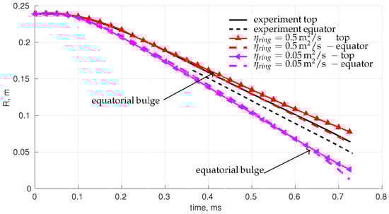 During the discharge of the capacitors, electric current flows through the coil generating a magnetic field around it (like in a solenoid). This poloidal magnetic field then induces a toroidal electric current in a thin layer of material at the outer surface of the lithium ring. This results in a Lorentz force acting upon the lithium ring in an inward radial direction and causing the ring to implode. Images of the imploding lithium ring captured by a high-speed camera are shown in Figure 8. It can be seen that the lithium ring remains symmetric during the implosion and its inner surface remains smooth without obvious buckles. The parameters and data for this implosion of the lithium ring were used to compare with the numerical results.