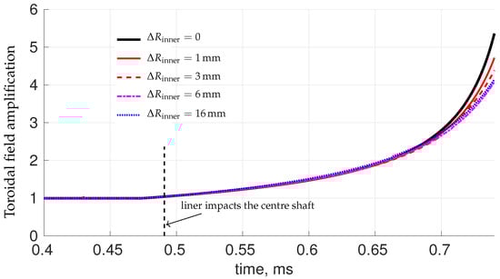 This can be explained by looking at the evolution of the poloidal magnetic field during the implosion in conjunction with the shape and trajectory of the liner. This is shown in Figure 26 for the nominal (first row) and higher (second row) magnetic diffusivity of the liner. The magnitude of the poloidal field is shown by a colour-map of the same scale in all plots. Contours of the poloidal flux are also shown for the same values in all plots and are coloured by the magnitude of the poloidal field. When comparing the results obtained at two values of magnetic diffusivity, the following can be observed: (i) a noticeably weaker pushing field for the higher value of magnetic diffusivity, even at early times (); (ii) the shape of the liner is significantly different by the time it approaches the centre shaft (); (iii) when the top and bottom of the liner get close to the centre shaft, the soaked through poloidal field is compressed, and this compressed field is stronger for higher magnetic diffusivity of the liner; (iv) for magnetic diffusivity of , the magnetic pressure from the compressed soaked-through magnetic field is sufficient to alter the shape of the liner and to prevent it from impacting the centre shaft; and (v) at later times the liner is noticeably slowed down by the push-back from the soaked poloidal field for the case with higher magnetic diffusivity. As such, for the liner with a magnetic diffusivity of , no electrical contact is established between the liner and the centre shaft (at least for the times being considered), which explains why no compression of the toroidal flux is observed in this case (see Figure 25b).