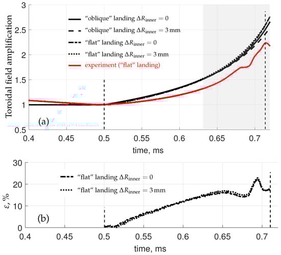 - The trapping and compression of the toroidal magnetic flux enclosed between the liner and the centre shaft, achieved in the Prototype 0 experiment, were successfully replicated in simulations. Simulation results provide an upper bound for the compression of toroidal flux by assuming instantaneous electrical contact between the liner and the centre shaft, whereas experimental results indicate that it takes time to establish good electrical contact, which leads to a slower rate of flux compression at early stages. The Prototype 0 experiment demonstrated toroidal field amplification by a factor of , and simulations reproduced this within a relative error margin of .
