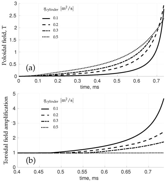 Effect of the liner’s magnetic diffusivity. (a) Evolution of the poloidal field; (b) evolution of the toroidal function F normalized by its initial value (toroidal field amplification). Results are shown for , (shown by the red dot in Figure 18b). Solid line—, dashed line—, dash-dot line—, dotted line—.