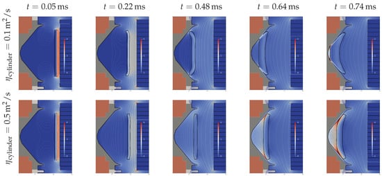 In Equation (22), the reference density and pressure were set to (density of solid lithium) and . Another important simplifying assumption for approximating solid lithium was the use of an isotropic Newtonian viscous stress tensor with a high constant value of dynamic viscosity (see Appendix A). For the experiments and parameter space considered here, using this simple model produced good results, as discussed later in this section. Magnetic diffusivity was set as a constant with a nominal value of , which corresponds to that of solid lithium at 100 °C. We note that in reality, the magnetic diffusivity (electric resistivity) of lithium depends on its local temperature and pressure, and such dependencies can be taken into account in the OpenFOAM model. However, for simplicity, we ignore these effects and analyze only the sensitivity of the results to different constant values of .
