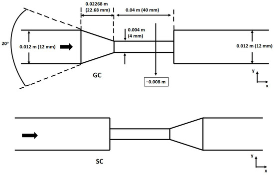 The dimensions of the nozzle include inlet and outlet zones of identical diameters (12 mm) and lengths of 1200 mm (100 D) in both configurations, ensuring that the entrance and exit effects are not significant. Between the inlet and outlet pipes, the GC configuration has a conical section providing a gradual transition to a 4 mm diameter throat section, and the SC composition has a sudden transition to the 4 mm throat section.