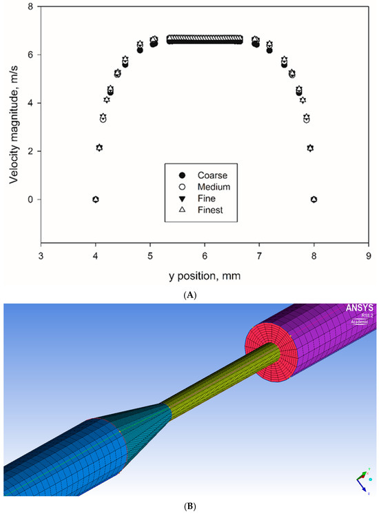 The computational mesh is created with the commercial software tool ICEM-CFD. Four different mesh densities (coarse, medium, fine, and finest) were generated for each nozzle configuration (GC and SC) using a multiblock-structured hexahedral grid with combined O-grid topologies to perform the mesh refinement study. Mesh independence results for the velocity of the GC configuration at the highest Reynolds number (Re = 6500) at a cross-section located −0.008 m below the throat (matching the experimental PIV location and also indicated in Figure 1) are shown in Figure 2A; the same refinement strategy was followed for the SC configuration. The mesh details, including the number of cells and nodes for each mesh level, are provided in Table 1. As shown in Figure 2A, velocity values in the nozzle system were independent of mesh sizes. A representative view of the computational mesh is shown in Figure 2B.