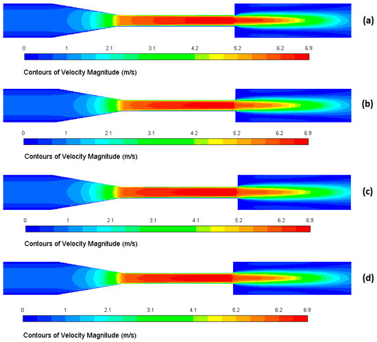Mesh independence was further verified by presenting the velocity contours on the center plane extending from inlet to outlet for the GC configuration at the highest Reynolds number (Re = 6500) for all four mesh densities (coarse, medium, fine, and finest) in Figure 3a–d. As can be seen from the contour plots, the velocity distribution remains essentially unchanged at all mesh refinements, confirming mesh independence for the selected mesh resolution. The same refinement study was performed for the SC configuration, and it also showed similar agreement. The maximum difference in peak velocity between the finest mesh and the other meshes was found to be 1.3% for coarse, 0.9% for medium, and 0.02% for fine mesh.