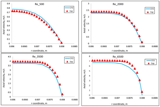 Validation of the flow behavior is critical in the CFD study of the nozzle with medical device features [17,29]. Hariharan et al.’s interlaboratory PIV data [21] were used to validate the CFD flow simulations. Axial velocity profiles were calculated along the radial direction at the cross-section located −0.008 m below the throat for the GC configuration. This location was chosen to match the position used in the experimental PIV measurements by Hariharan et al. [21], which served as the reference data for validation. This region is located in the throat, which is crucial since velocity gradients are most significant and make it suitable for determining the accuracy of CFD predictions against experimental results. The location of the −0.008 m section is also indicated in Figure 1 for clarity. Four inlet velocities were compared: 0.05 m/s, 0.18 m/s, 0.32 m/s, and 0.60 m/s, corresponding to throat Reynolds numbers of 500, 2000, 3500, and 6500, respectively (presented in Figure 4).