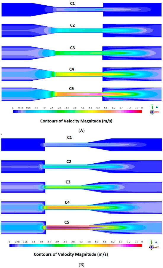 (A) Velocity magnitude contours for the GC configuration for 0.05 m/s, 0.18 m/s, 0.32 m/s, and 0.60 m/s inlet velocities corresponding to throat Reynolds numbers of 500, 2000, 3500, and 6500 (shown as C1 to C5), respectively. (B) Velocity magnitude contours for the SC configurations for 0.05 m/s, 0.18 m/s, 0.32 m/s, and 0.60 m/s inlet velocities corresponding to throat Reynolds numbers of 500, 2000, 3500, and 6500 (shown as C1 to C5), respectively.
