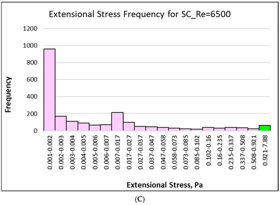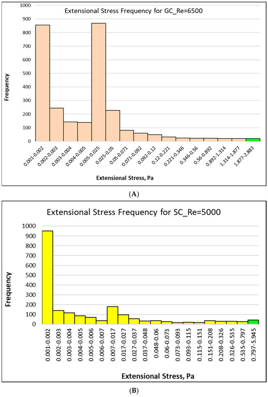Simulations were performed for three experimental cases, which are GC at Re = 6500, SC at Re = 5000, and SC at Re = 6500. With varying levels of hemolysis (0.008–0.5%) achieved using the FDA nozzle configurations, the significance of extensional stresses in relation to hemolysis can be understood from a unique perspective. Experimental % hemolysis values were acquired from the original work of Hariharan et al. [21]. The spatial distributions of extensional stresses were determined for each experiment of the two nozzle configurations. For each simulation, a threshold value of extensional stress associated with hemolysis was estimated using constant stress contour maps. The level of contour surrounding a volume fraction equal to the experimental hemolysis percentage was defined as the threshold stress. For example, in an experiment with a 0.5% hemolysis rate, the stress value corresponding to the contour surrounding 0.5% of the area was chosen as the threshold. A histogram of results (Figure 7A–C) shows that for three experiments examined (Table 3) the threshold extensional stress was found to be 2.8 Pa (shown with green color in Figure 7A–C), which means that, for example, 0.008% (hemolysis level of GC model at Re = 6500 experiment) of the spatial distribution of extensional stress was above this value. In addition to local extensional stress peaks, this frequency-based analysis not only provides information on where the highest stress occurs but also reveals how much of the area is subjected to different stress levels, thus providing a comprehensive picture of the overall mechanical stress loading.