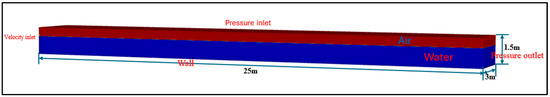 A NWT with dimensions of 25 m in length, 3 m in width, and 1.5 m in depth is used in the simulation. Detailed boundary settings are given in Figure 2. The front, back, and bottom walls are considered as no-slip boundary conditions, indicating that the fluid velocity at the interface with these solid surfaces is zero [29]. The left boundary of the computational domain is set as a velocity inlet with wave inflow applied through a UDF. The right end of the NWT is defined as a pressure outlet; the top boundary is specified as a pressure inlet open to the atmosphere