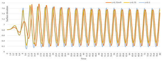 The wavelength conditions are calculated using the wave period (T) in seconds, the initial water depth (H) of 6.8126 m, and the wave amplitude (A) in meters, as defined by Equation (6). A transient simulation was conducted for 80 s without a damping zone to analyze the interaction between the simulated wave and the OBS under various wave parameters.