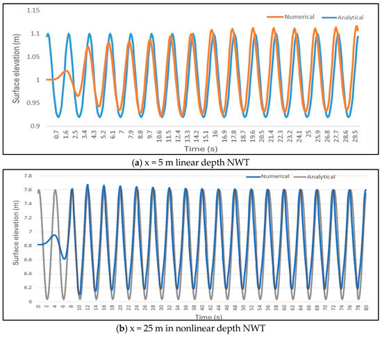 To validate the current numerical setup for simulating intermediate-depth gravity waves, the free surface elevation in the NWT is compared with the analytical solution, please refer to Equation (6), based on Stokes second order wave theory [25].