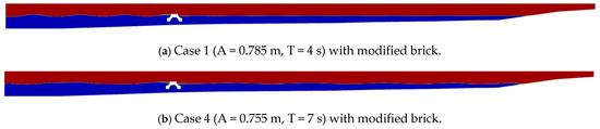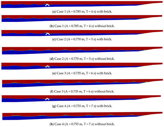 By comparing the surface elevations, a drastic change in the wave amplitude is observed for case 1, while only a small change is seen for case 4, as shown in Figure 18a,b. A reduction in wave amplitude is evident with the modified brick, indicating that it is effectively dissipates the energy of incoming waves.