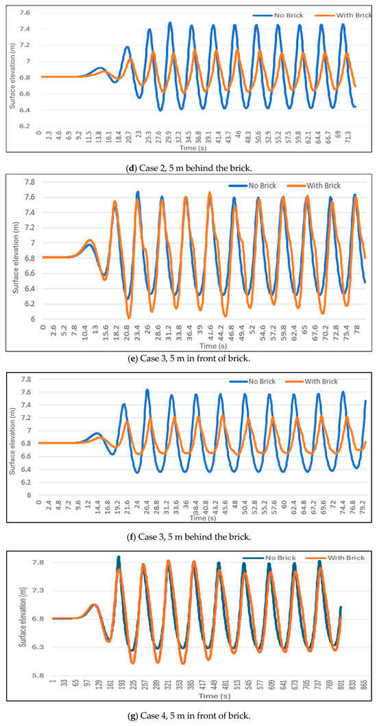 Surface elevations at 5 m in front and behind the brick for different wave parameters.
