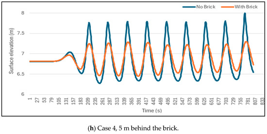 To evaluate the wave-brick interactions, the water surface elevation is tracked at two locations: 5 m in front of the brick and 5 m behind it. As shown in Figure 13a–d for shorter wavelengths (Case 1 and 2), the compounding effects between subsequent waves are negligible, and the brick dissipates the wave energy effectively. In contrast, for longer wavelengths (Case 3 and 4), wave interactions become more complex as subsequent waves collide and interfere with one another. As a result, the OBS bricks are less effective at quickly dissipating the wave quickly, as shown in Figure 13e–h.