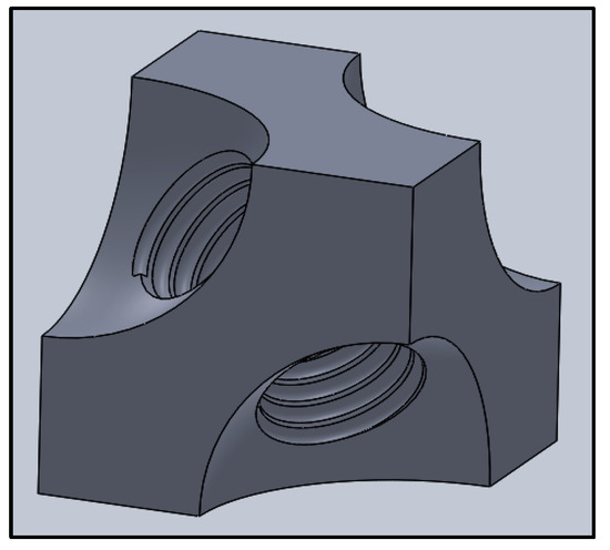The brick structure is modified only along the internal tunnels to maintain its overall structural integrity (see Figure 15). The two tunnel sizes on the side of the incoming wave are enlarged to 1.8 m to capture more wave energy, while the remaining two tunnels are kept at 1.6 m and 1.4 m, respectively. The drill holes are tapered to form converging diverging nozzles, which generate back pressure to resist incoming waves at each time step. Threading is introduced along these tapered tunnels, causing the water to swirl, as illustrated in Figure 16. The taper helix method is used in SolidWorks 2024 while generate the modified geometry. For the thread, the height is 0.9 m, pitch is 0.25 m taper helix angle is 11.50 degree. The thread surface mesh size is 0.13 m. The swirling motions from opposite directions collides at the center of the brick, effectively dissipating the wave energy.