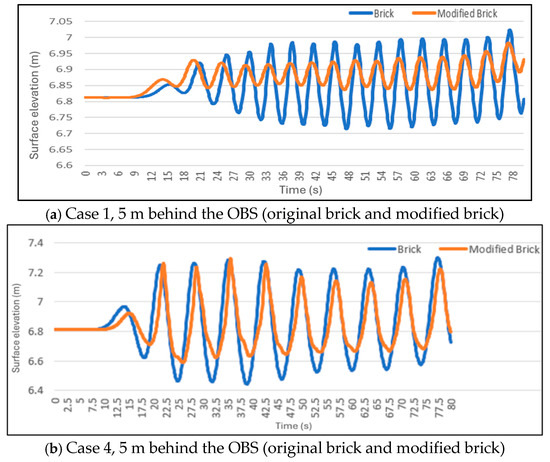 Wave interactions with modified brick for cases 1 and 4 are shown in Figure 17, the surface elevation behind the brick for case 1 appears relatively still, whereas in case 4, slight surface elevations can be observed as wave passes. However, it is difficult to see the difference in wave interactions with original bricks from Figure 13. Further direct comparison is therefore given in Figure 18.
