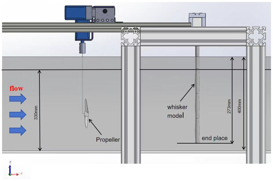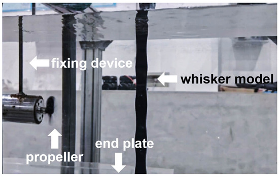 This experiment was conducted in a low turbulence circulating water flume at the Fluid Mechanics Laboratory of Tianjin University. The experimental schematic and model settings are shown in Figure 1. The testing section of the circulating water flume is 400 mm × 306 mm × 2370 mm (height × width × length). The water depth in the flume is maintained at 330 mm, and the flow velocity range covers U∞ = 0.05–0.40 m/s. In this experiment, U∞ = 0.0 m/s, 0.10 m/s, 0.15 m/s, and 0.20 m/s are mainly selected as the main inflow velocity conditions for research. To avoid complex tail vortex shedding, end plates with dimensions of 2 mm × 200 mm × 300 mm (thickness × width × length) were horizontally placed below the whisker model. The propeller is tied to the waterproof motor through a fixed device and placed upstream of the water flume, while the whisker model is placed downstream of the water flume.