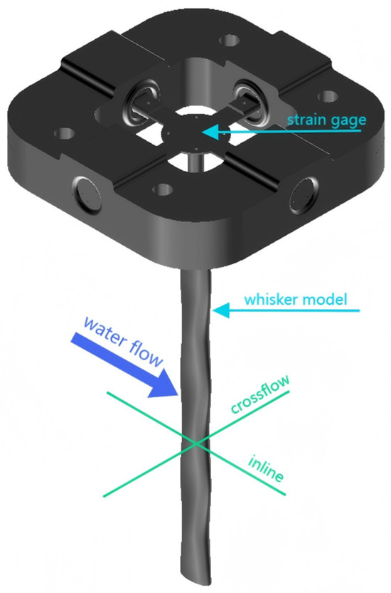 The vibration response of the model within the flow field is measured using a four-limb steel sheet instrumented with strain gauges, as illustrated in Figure 3. Each limb of the steel sheet is connected to a ball bearing mounted on a 3D-printed polymer base. This support system is designed to enable two-degree-of-freedom rotational vibrations of the whisker model, mimicking the vibrissa follicle-sinus complexes (F-SCs) of the harbor seal. The use of ball bearings effectively decouples rotational vibrations in the two directions. As a result, the vibration responses are manifested as bending deformations in the steel limbs, which are captured via the strain gauges. The whisker model is positioned vertically in the water flume, where it is subjected to both propeller-induced and incoming flow. Displacement variations and vibration amplitudes in the flow field can be quantitatively determined through strain analysis. The linear measurement error is specified as ±0.05–2 mm. In our setup, the whisker vibration amplitudes typically exceeded 0.5 mm, which places them well above the sensor’s minimum resolution. The signal-to-noise ratio was further improved through averaging and filtering, ensuring reliable detection of both small and large vibration components, as validated in the previous studies [23,24].