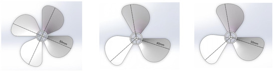 Figure 4 shows the three different propellers selected for comparative research in this experiment. The propeller with an outer diameter of Dp = 60 mm is a four bladed propeller, while the propellers with Dp = 80 and 100 mm are three bladed propellers. For these propellers, the same speed conditions were set in this experiment, with the rotational speed Np = 0, 2000, 3000, 4000, and 5000 r/min, to generate a wide range of propeller wake. In this experiment, the separation distance L between the seal whisker model and the propeller was set to be 10, 20, and 30 times the equivalent diameter of the whisker model. The key parameters are summarized in Table 1.