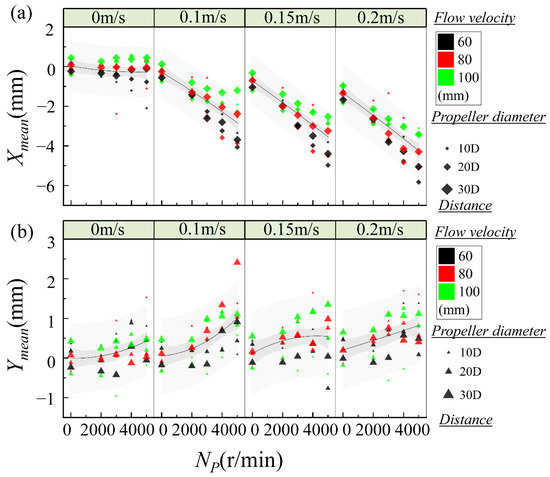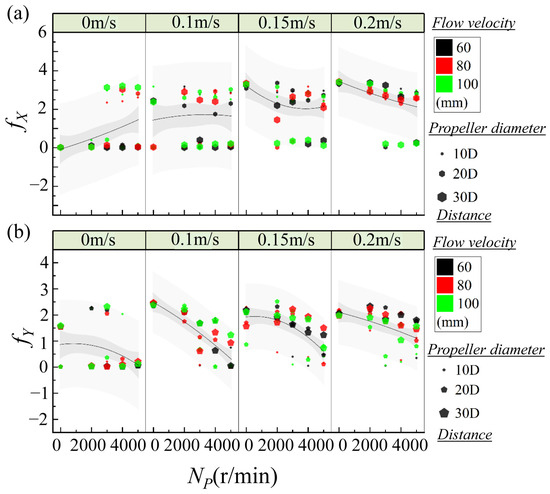 Mean (a) inline and (b) crossflow vibration amplitudes with propeller rotational speed Np. Four regions are divided by the inflow velocity U∞. The symbol size and color further indicate the separation distance and propeller diameter, respectively. The black line shows the fitting curve for the vibration response with the parameter. The shadows in dense grey and light grey around the fitting curve indicate the 95% confidence and 95% prediction bands, respectively. These captions are same as those in Figures 6, 7 and 10–12.