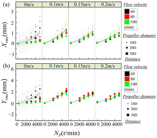 Root Mean Square (rms) of (a) inline and (b) crossflow vibration amplitudes with propeller rotational speed Np. Same symbol notations as in Figure 5.