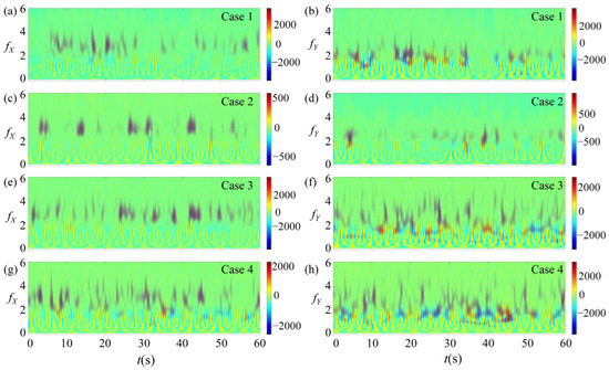 To further explore the evolution and coupling of dominant frequency modes over time, four representative cases were selected based on distinct dynamic transitions observed in both the vibration amplitude and frequency analyses. These cases were strategically chosen to represent key breakpoints in the parameter space: Case 1 (U∞ = 0.00 m/s, Nₚ = 3000 r/min, L/D = 10, Dₚ = 100): Exhibits inline frequency lock-in at 1.0 × fnx in stagnant flow. Ideal for studying wake–whisker coupling in the absence of inflow shear. Case 2 (U∞ = 0.00 m/s, Nₚ = 4000 r/min, L/D = 30, Dₚ = 80): Represents a higher-speed case with longer separation and persistent inline resonance. Highlights effects of spacing on spectral persistence. Case 3 (U∞ = 0.10 m/s, Nₚ = 3000 r/min, L/D = 10, Dₚ = 100): Displays subharmonic CF excitation (0.5 × fny) with strong inline energy, reflecting early-stage vortex pairing in convected wakes. Case 4 (U∞ = 0.10 m/s, Nₚ = 4000 r/min, L/D = 20, Dₚ = 60): Shows subharmonic inline response (0.5 × fnx), possibly indicating slaloming or vortex leapfrogging effects. These cases offer a representative spectrum of behaviors across wake development stages and interaction intensities. Their selection ensures coverage of key response regimes: subharmonic, harmonic (lock-in), and non-resonant behaviors, under both stagnant and flowing conditions. Wavelet transform allows tracking the evolution of dominant frequencies over time, which is particularly valuable for wake-induced vibrations where flow unsteadiness and vortex disintegration can lead to temporal frequency modulation.