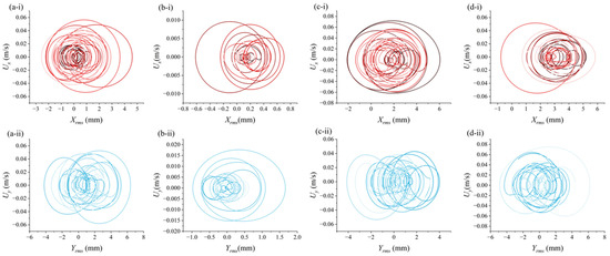 To further elucidate the dynamic stability and qualitative nature of the wake-induced vibration (WIV) responses of the whisker model, phase trajectory analysis was conducted for the inline and crossflow motions of in four representative test cases. Phase trajectories are constructed by plotting the displacement response against its time derivative, effectively visualizing the system’s motion in the phase space, as shown in Figure 9. This approach allows for a qualitative assessment of the vibratory behavior, distinguishing between periodic, quasi-periodic, and chaotic responses. In general, closed and elliptical loops signify stable periodic oscillations; distorted orbits may indicate weak nonlinearity or transition; while irregular, aperiodic patterns are hallmarks of chaotic or turbulent-induced dynamics.