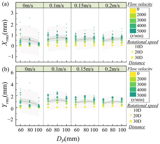 Root Mean Square (rms) of (a) inline and (b) crossflow vibration amplitudes with propeller diameter Dp. The rotational speed of the propeller and separation distance are indexed by symbol color and size, respectively.