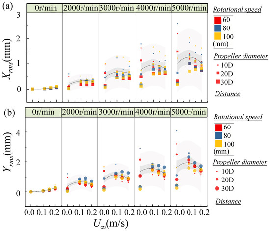 Root Mean Square (rms) of (a) inline and (b) crossflow vibration amplitudes with inflow velocity U∞. Four regions are divided by the propeller rotational speed NP. The symbol color and size indicate the propeller diameter and separation distance, respectively.