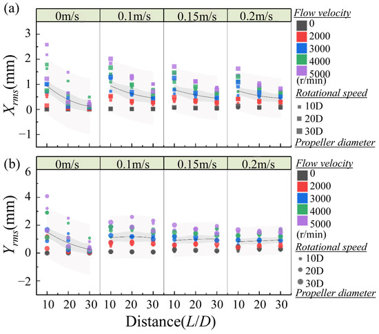 Root Mean Square (rms) of (a) inline and (b) crossflow vibration amplitudes with separation distance L/D. The rotational speed and diameter of the propeller are indexed by symbol color and size, respectively.