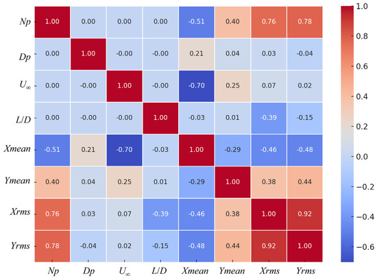 To quantitatively evaluate the influence of each input parameter—propeller rotational speed (Np), diameter (Dp), inflow velocity (U∞), and separation distance (L/D)—on the whisker vibration characteristics, a Pearson correlation (r) matrix analysis was performed, as shown in Figure 13. The response variables included the inline (IL) and crossflow (CF) root-mean-square (rms) amplitudes and mean displacements. As shown in Figure 13, the correlation matrix reveals distinct trends: Inflow velocity (U∞) shows the strongest positive correlation with Yrms (r = +0.74) and a substantial correlation with Xrms (r = +0.62), confirming its primary role in enhancing wake convection and vortex–structure interaction. Propeller rotational speed (Np) also strongly correlates with Xrms (r = +0.66) and Yrms (r = +0.63), indicating that higher tip vortex intensity reinforces vibration amplitudes. Separation distance (L/D) exhibits a negative correlation with both Xrms (r = −0.68) and Yrms (r = −0.59), reflecting the wake energy decay and loss of coherence with increasing downstream distance. Propeller diameter (Dp) shows a relatively weaker and slightly negative correlation, particularly with Yrms (r = −0.31), suggesting that larger diameters may diffuse wake structures and reduce localized forcing on the whisker tip. These results quantitatively support the physical interpretations drawn from earlier visual analyses. The dominant role of rotational speed and inflow velocity across both IL and CF directions highlights their fundamental importance in shaping wake–structure interaction strength. Meanwhile, the consistently negative impact of separation distance confirms its spatial filtering effect on wake energy transfer.