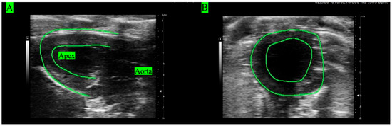 ECHOs of the LV in (A) longitudinal view and (B) short view.