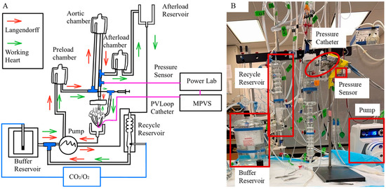 (A) Retrograde perfusion in Langendorff mode (indicated by red arrow) and antegrade perfusion in working heart mode (indicated by green arrow). (B) Isolated heart perfusion system.